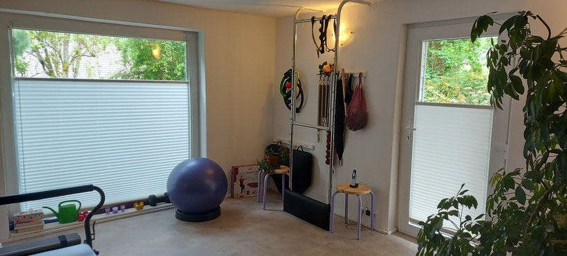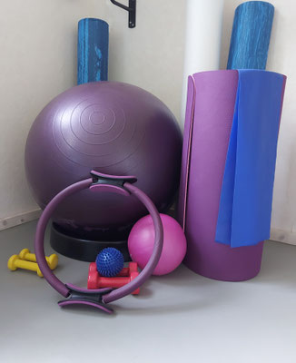 Im Studio stehen zur Verfügung Pilates Großgeräte (z.B Reformer, Wall Tower und Ladder Barrel), eine Sproßenwand und natürlich auch Matten und